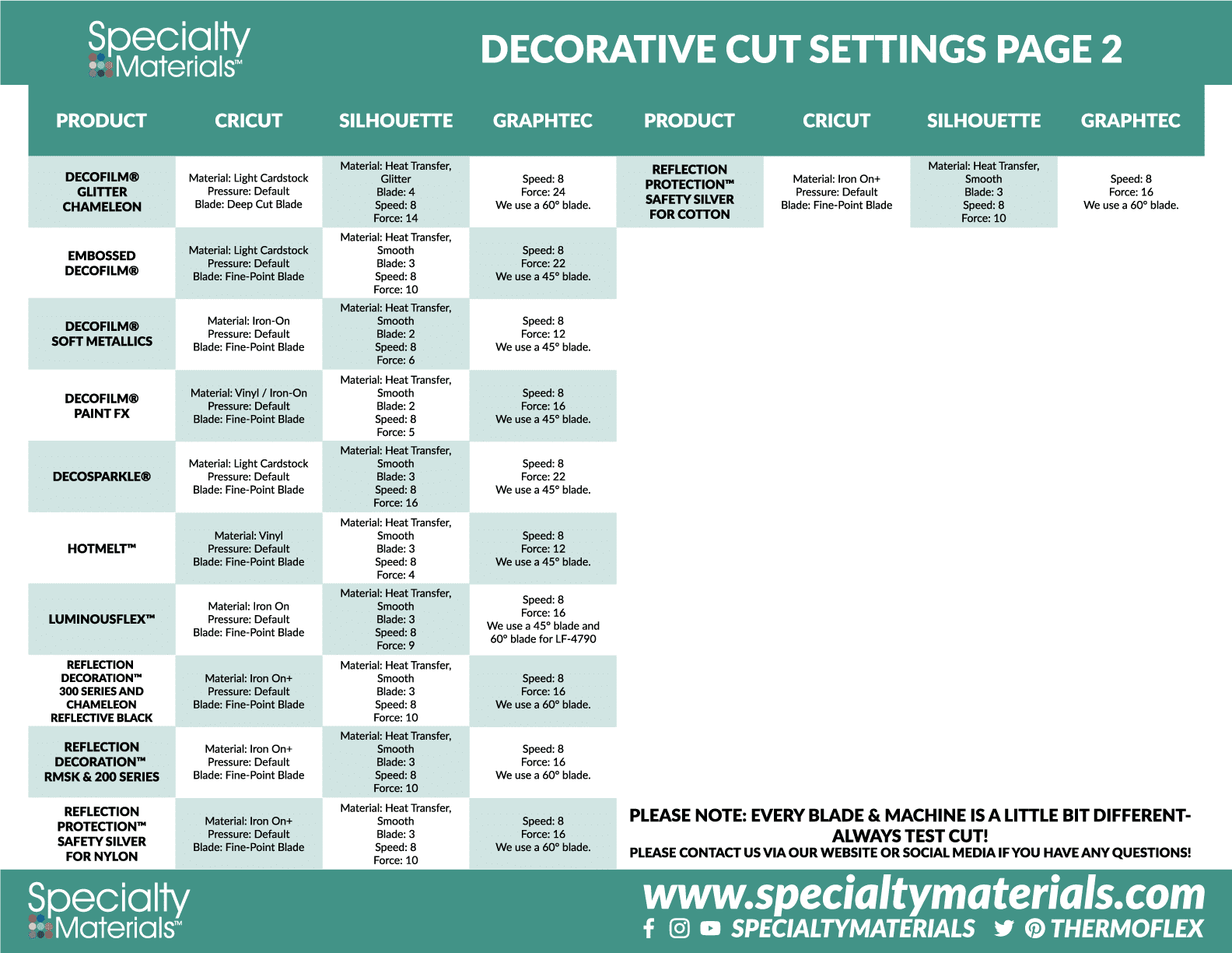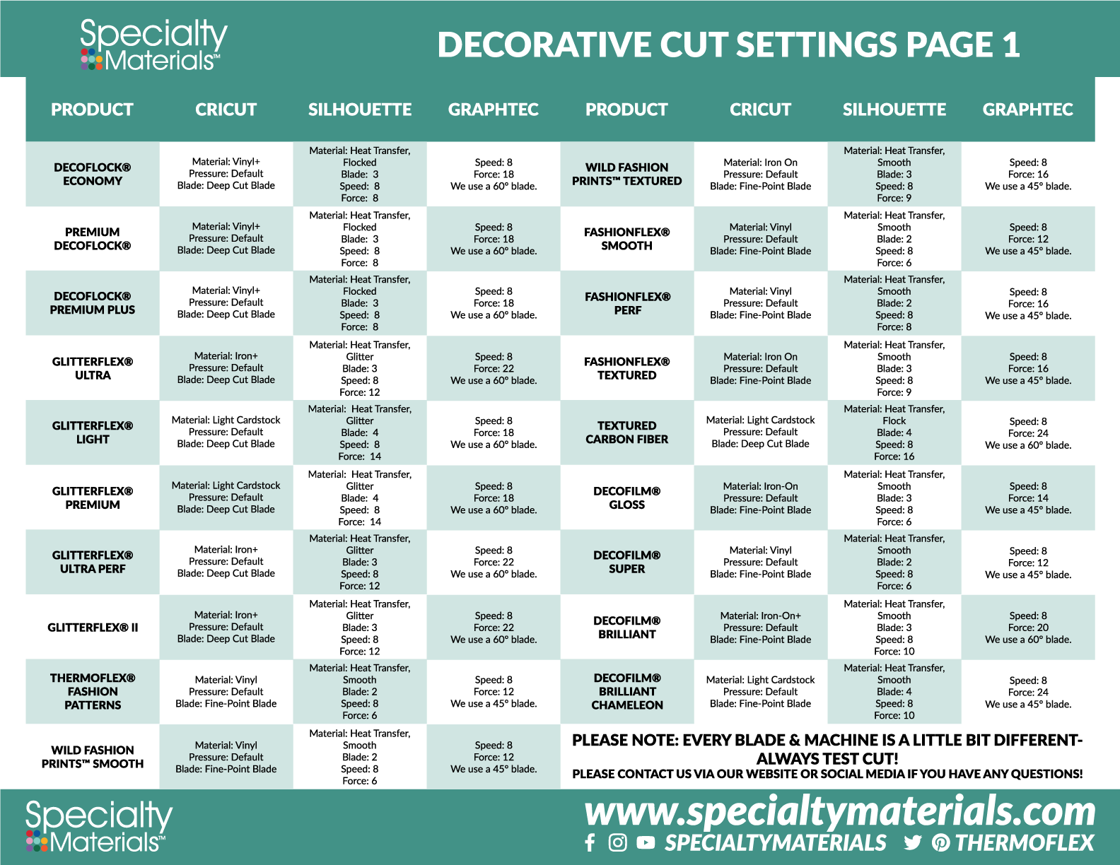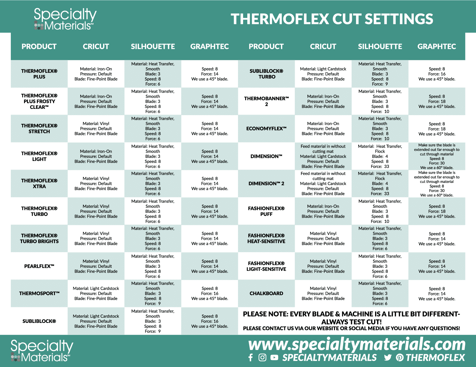 PLEASE NOTE: Every blade and machine is a little bit different- always remember to test cut! These cut settings are a starting point to be adjusted to your blade and machine.